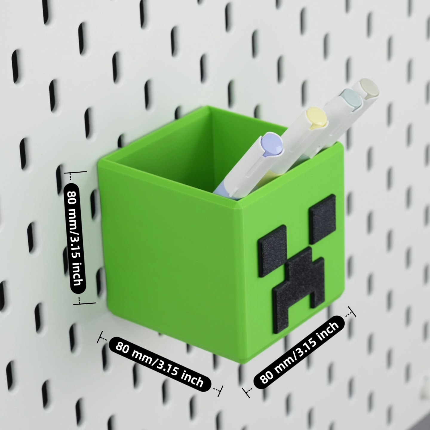 Modeled after the iconic Minecraft Creeper, this 3-in-1 organizer snaps onto any IKEA Skådis pegboard, standard 1/4" pegboard, or sits freestanding on your desk—perfect for pens, cables, mini-figures, or even potions of creativity.