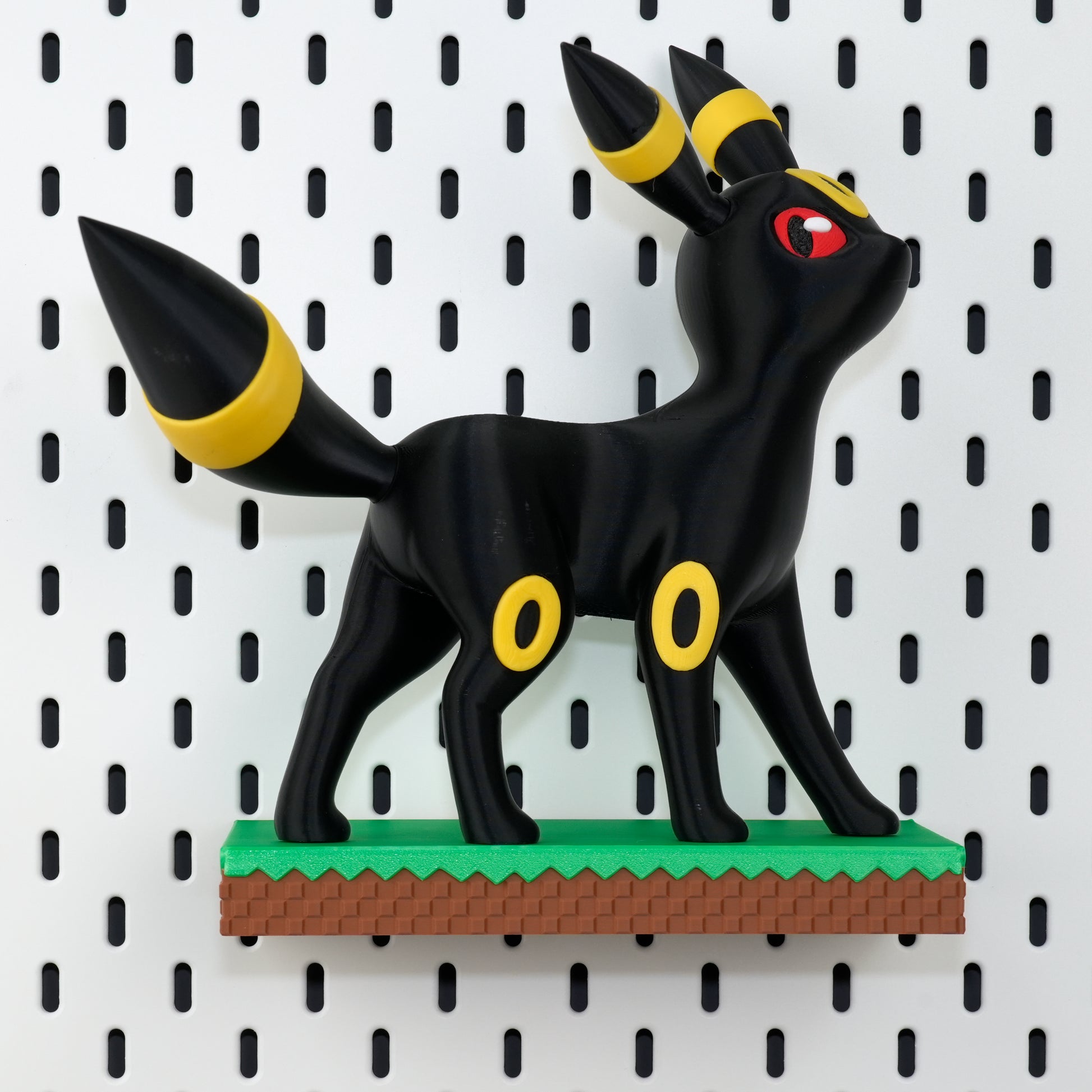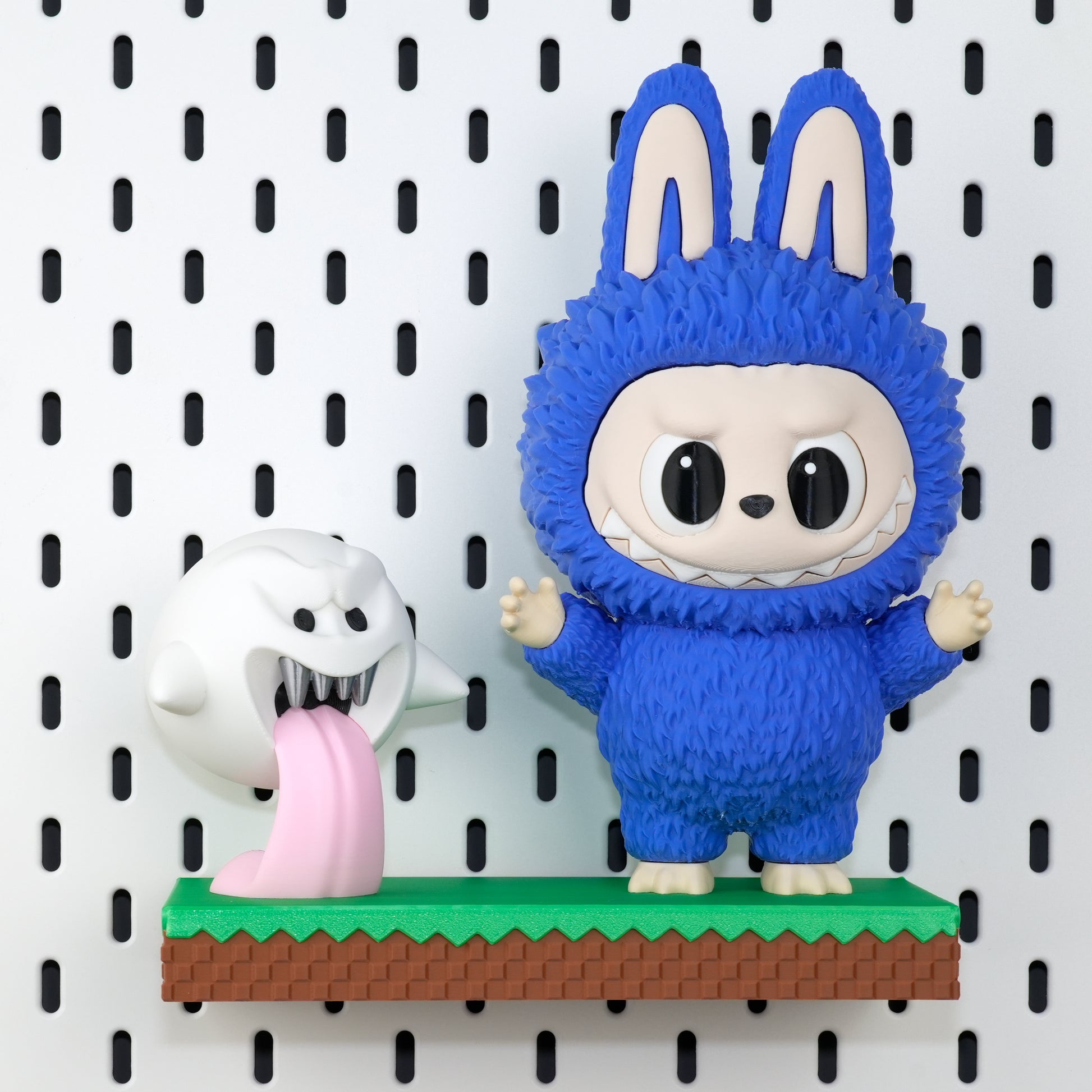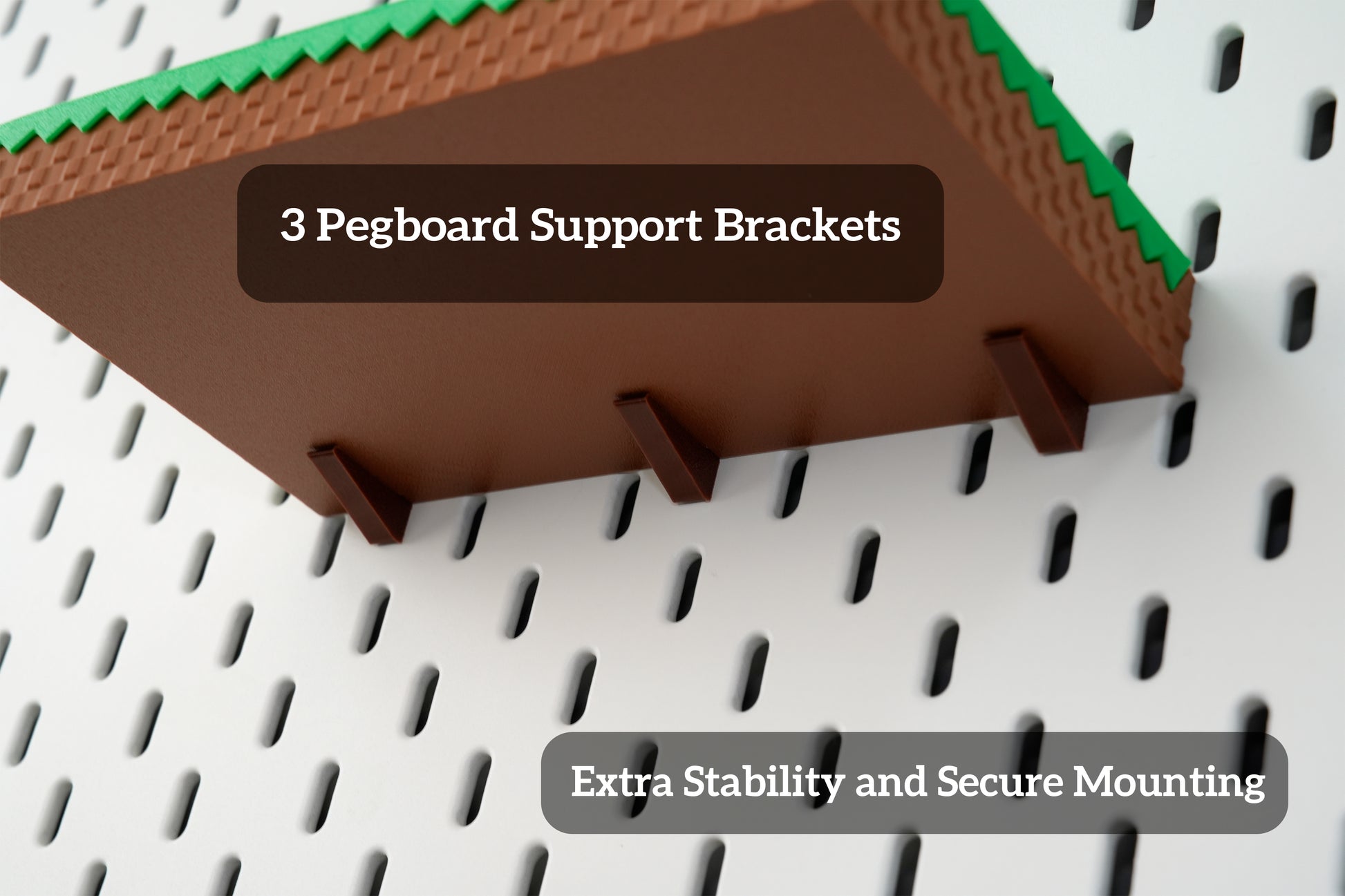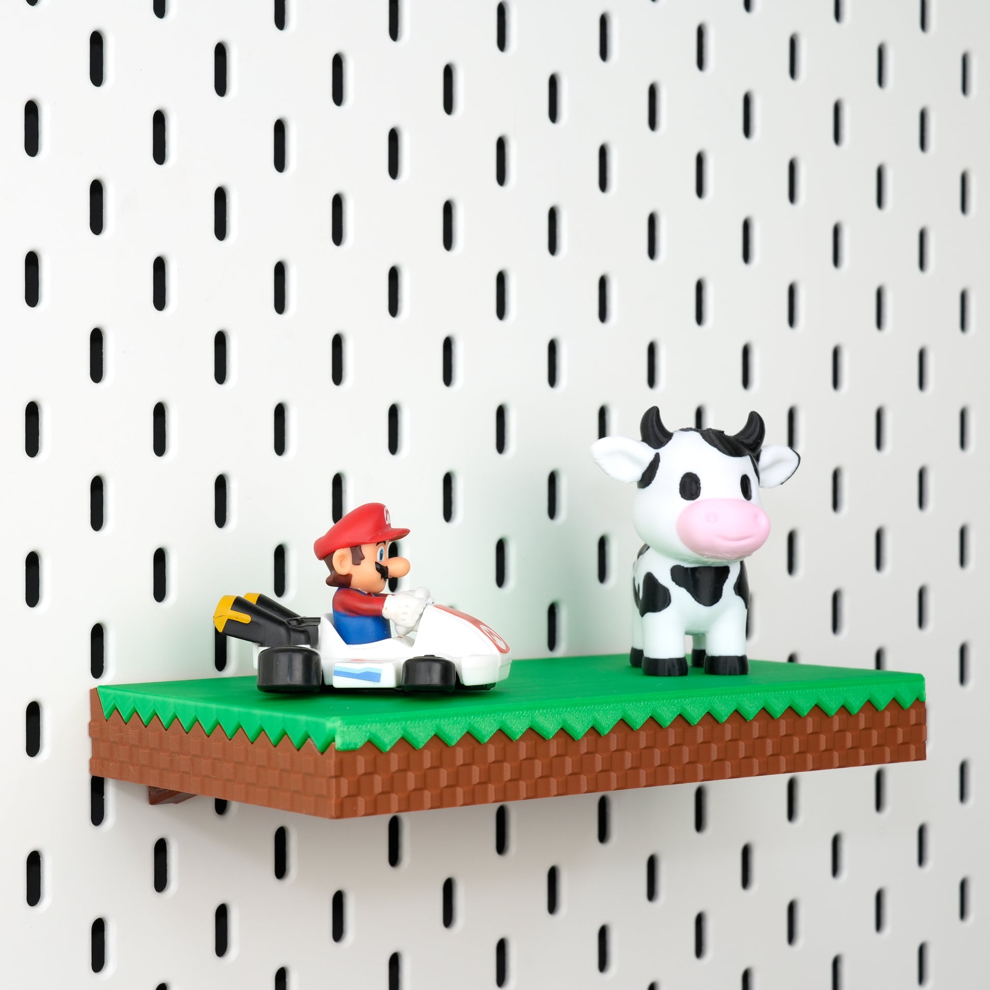 This grass-block shelf is modeled straight from Minecraft’s iconic turf—complete with pixel-perfect blades of grass and earthy side pixels. At only 2.4 cm / 0.9" thick it sits flush against IKEA Skådis or any standard 1/4″ pegboard, giving mini-figures, Funko Pops, key-caps or even your phone a floating-block look.