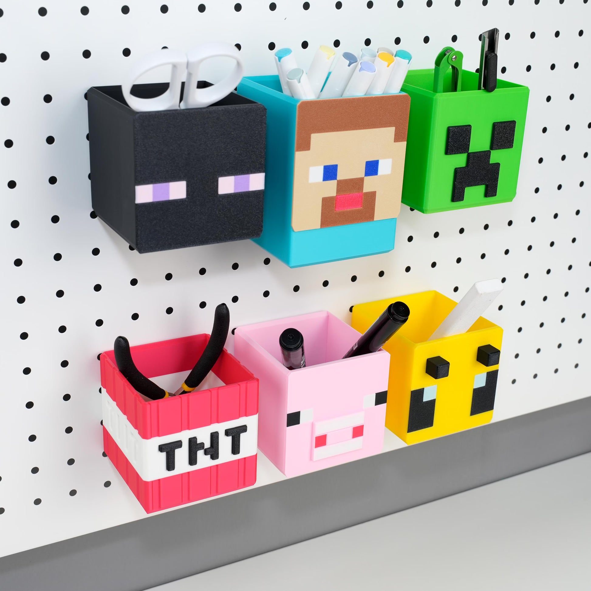 This Minecraft Pegboard Bin Set drops the TNT, Creeper, Enderman, Pig, Bee and Steve right onto your board—each box 3-D printed in tough PLA, sized for bits, batteries or bricks. No mods, no tools: just hang, fill and keep your desk creeper-free.