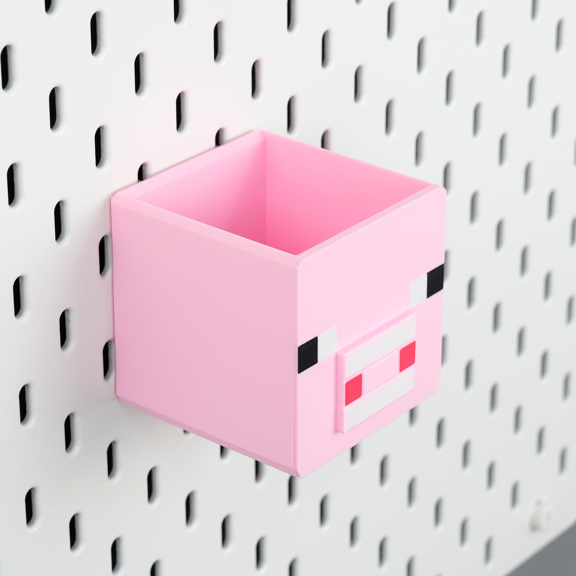 Modeled after the iconic Minecraft Pig, this 3-in-1 organizer snaps onto any IKEA Skådis pegboard, standard 1/4" pegboard, or sits freestanding on your desk—perfect for pens, cables, mini-figures, or even potions of creativity.